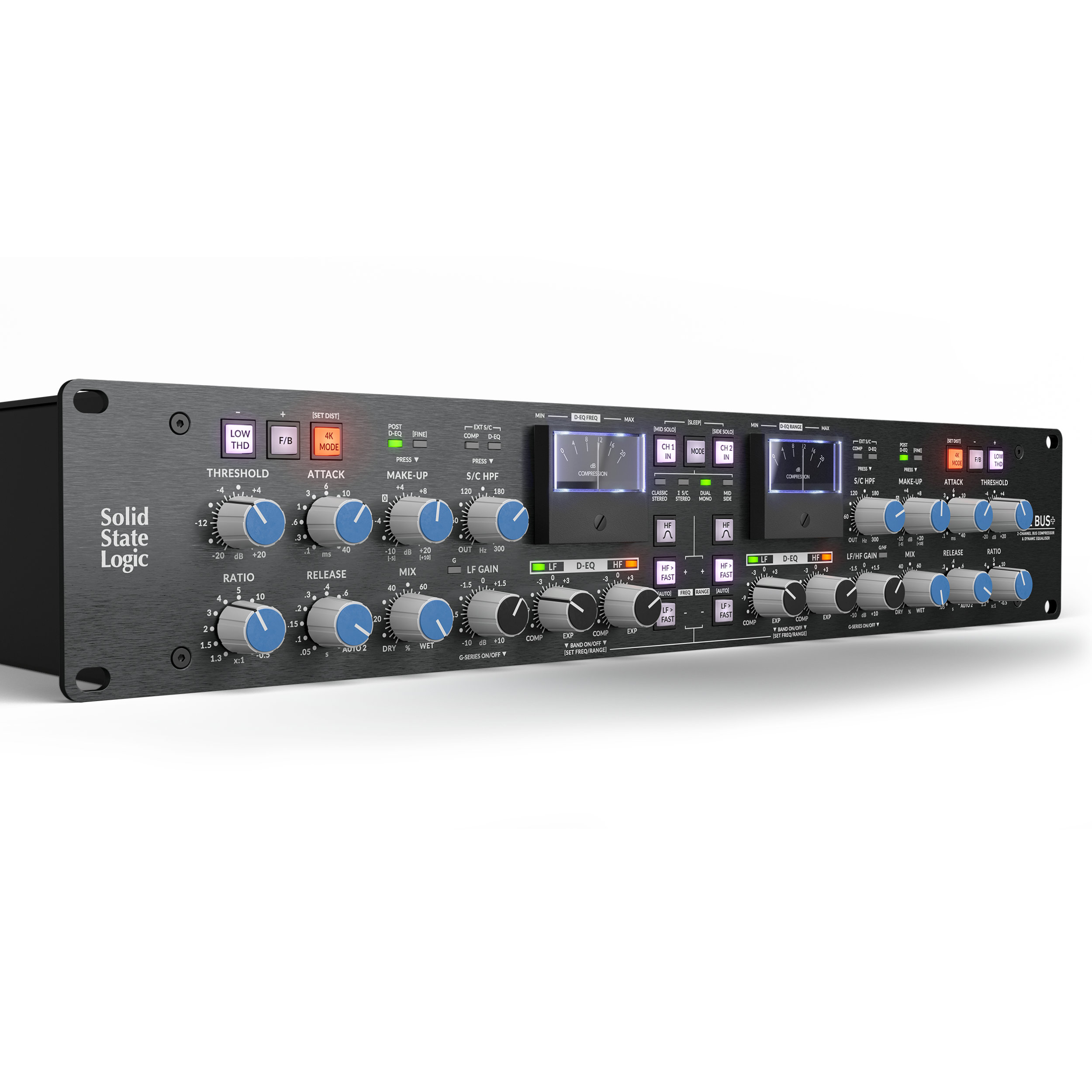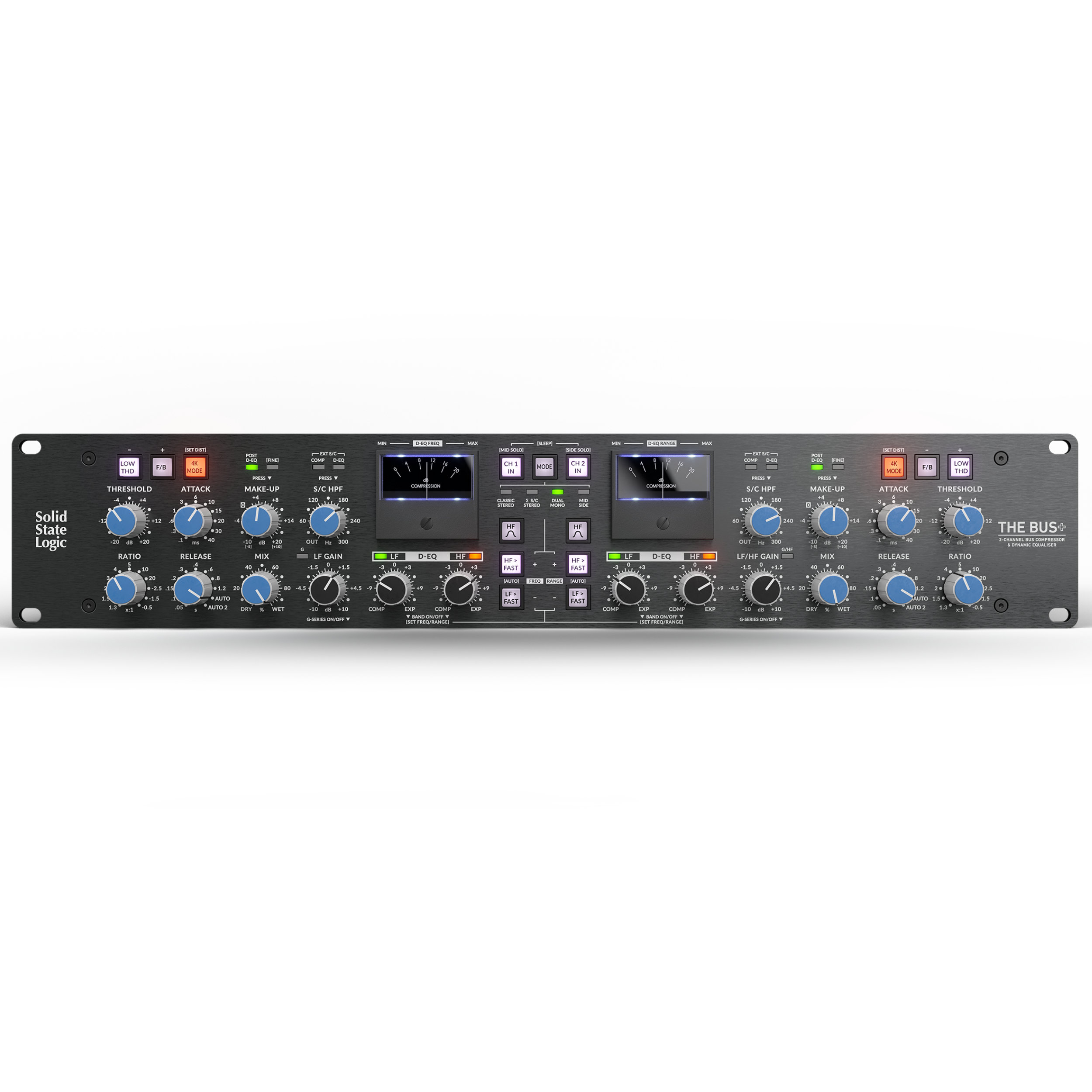 Bring classic SSL mix-bus compression to your rack with THE BUS+, a 2U powerhouse featuring THAT 2181 VCA chips, four operating modes (Stereo, Side‑Chain Stereo, Dual Mono, Mid-Side), three compression colours (Low THD, F/B, 4K Mode), a 2‑band analogue Dynamic EQ (D‑EQ), stepped digital controls, variable side‑chain HPF, external side‑chain, transient expander, and precision recallability—all in sleek rack format.
